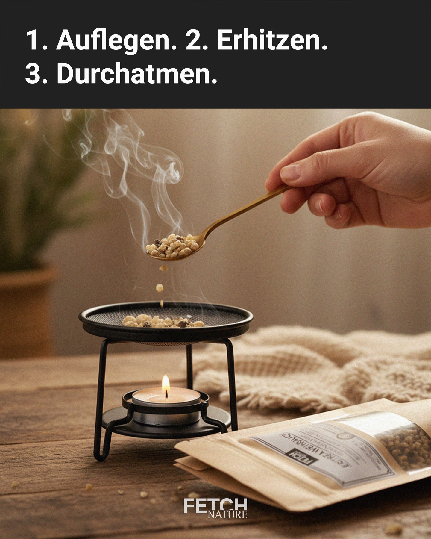 Beim indirekten Erwärmen auf einem Sieb oder in einer Aromaschale verströmt das Harz einen feinen, frischen Duft – zitronig, leicht, befreiend.