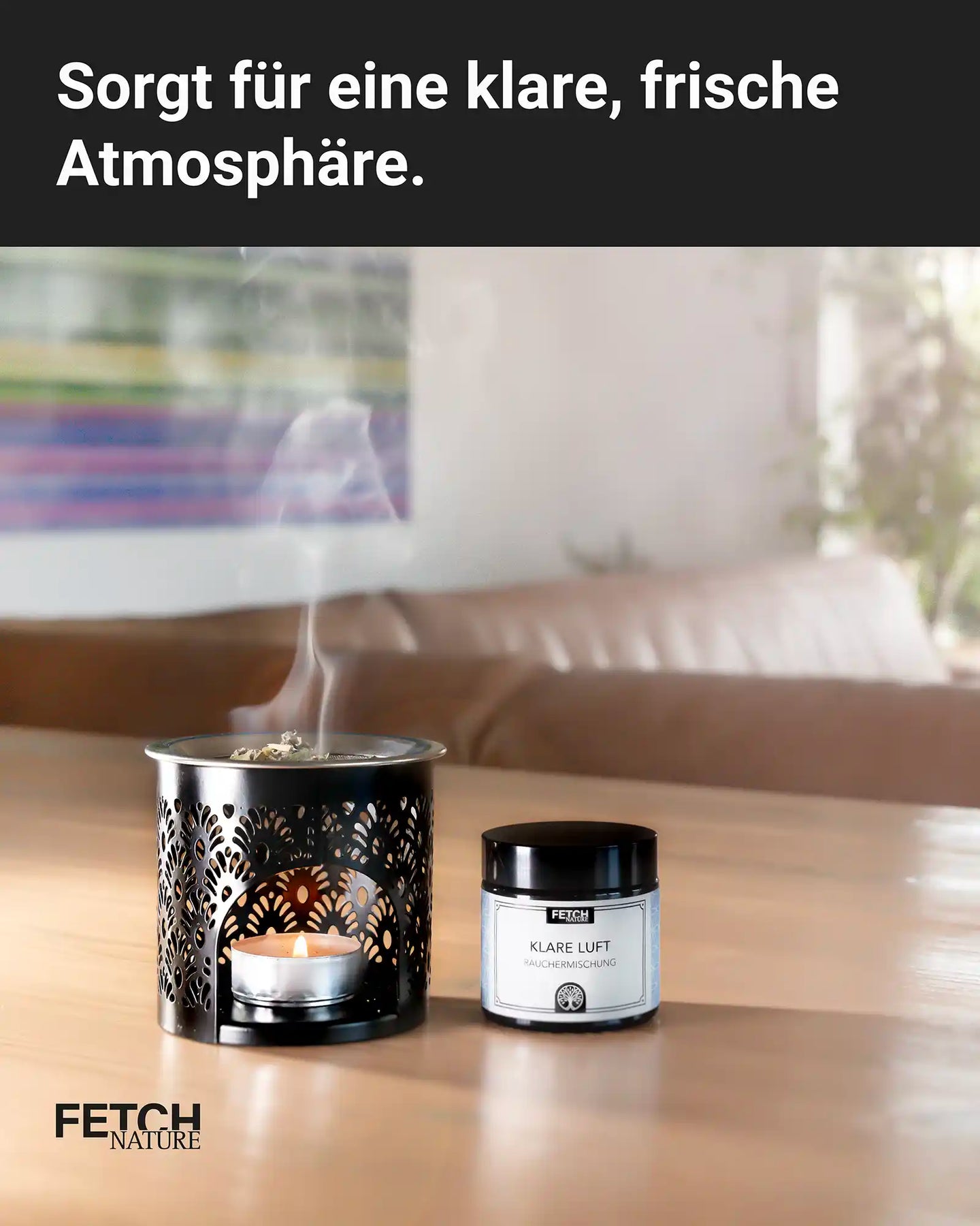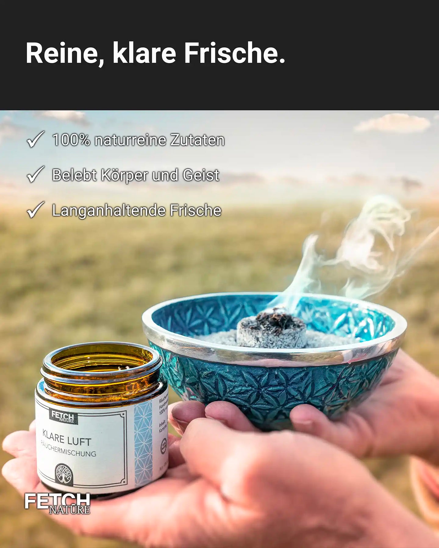 Die Räuchermischung Klare Luft ist perfekt für alle, die sich nach einer klaren und reinen Raumluft sehnen. Diese handgefertigte Mischung aus erlesenen Kräutern und Harzen wie Gummi-Olibanum, Salbei, Kampfer, Ysop und Lavendel wurde speziell entwickelt, um das Raumklima zu reinigen und eine wohltuende Frische zu verbreiten. Jeder Inhalt in der 50 ml-Dose wurde im Allgäu mit höchster Sorgfalt zusammengestellt, um Ihnen ein einzigartiges Räuchererlebnis zu bieten.