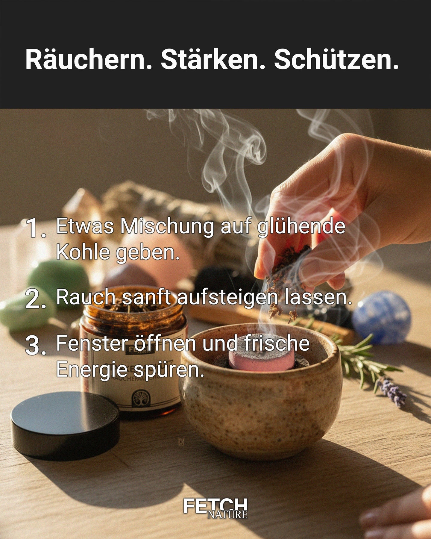 Sprich beim Räuchern eine klare Absicht: „Ich bin geschützt, stabil und voller Kraft.“ So verstärkst du die energetische Wirkung der Mischung.